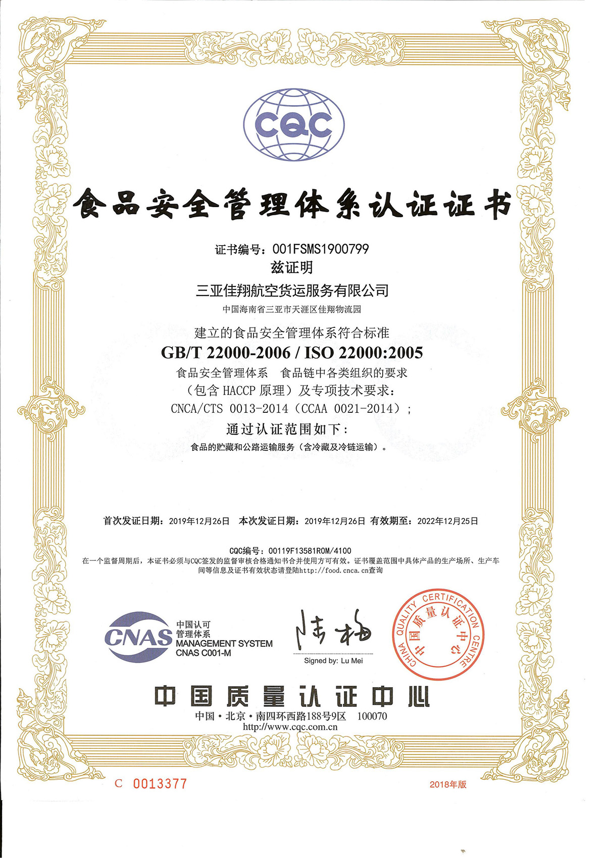 食品安全管理體系認(rèn)證證書